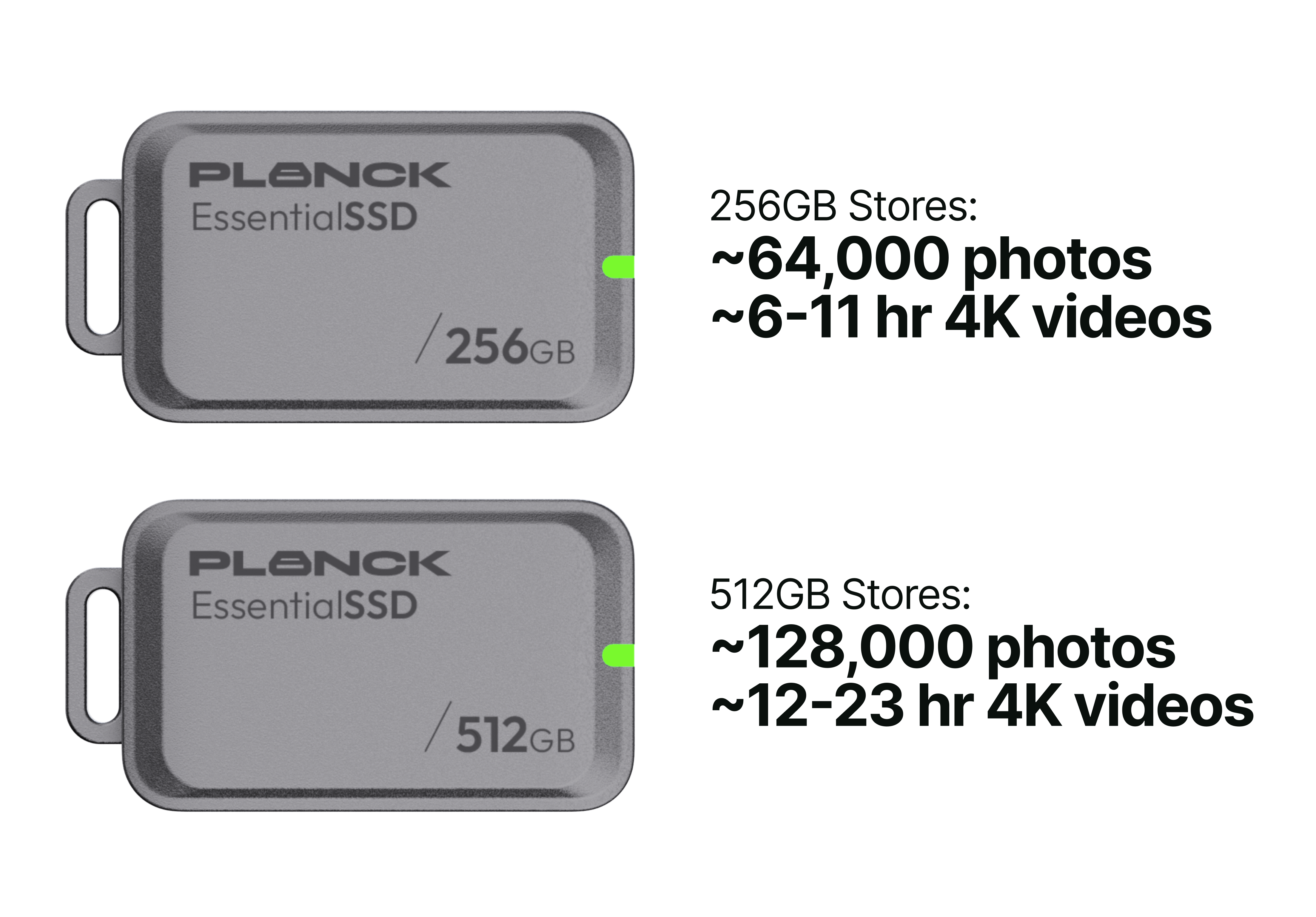 256GB or 512GB—perfect for trips, events, and weekly backups.
